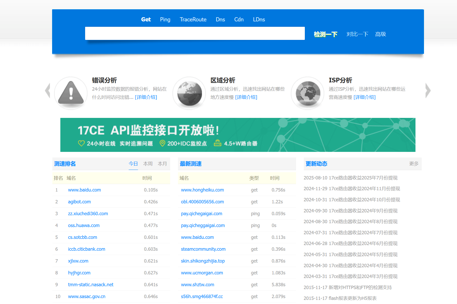 实测下来,17ce 的国内节点密度是同类工具中较高的 —— 覆盖 34 个省市(含新疆、西藏等边缘地区),同时包含香港、台湾及新加坡、日本等东亚节点,支持Ping 值测试与路由跟踪(Traceroute) 双功能。