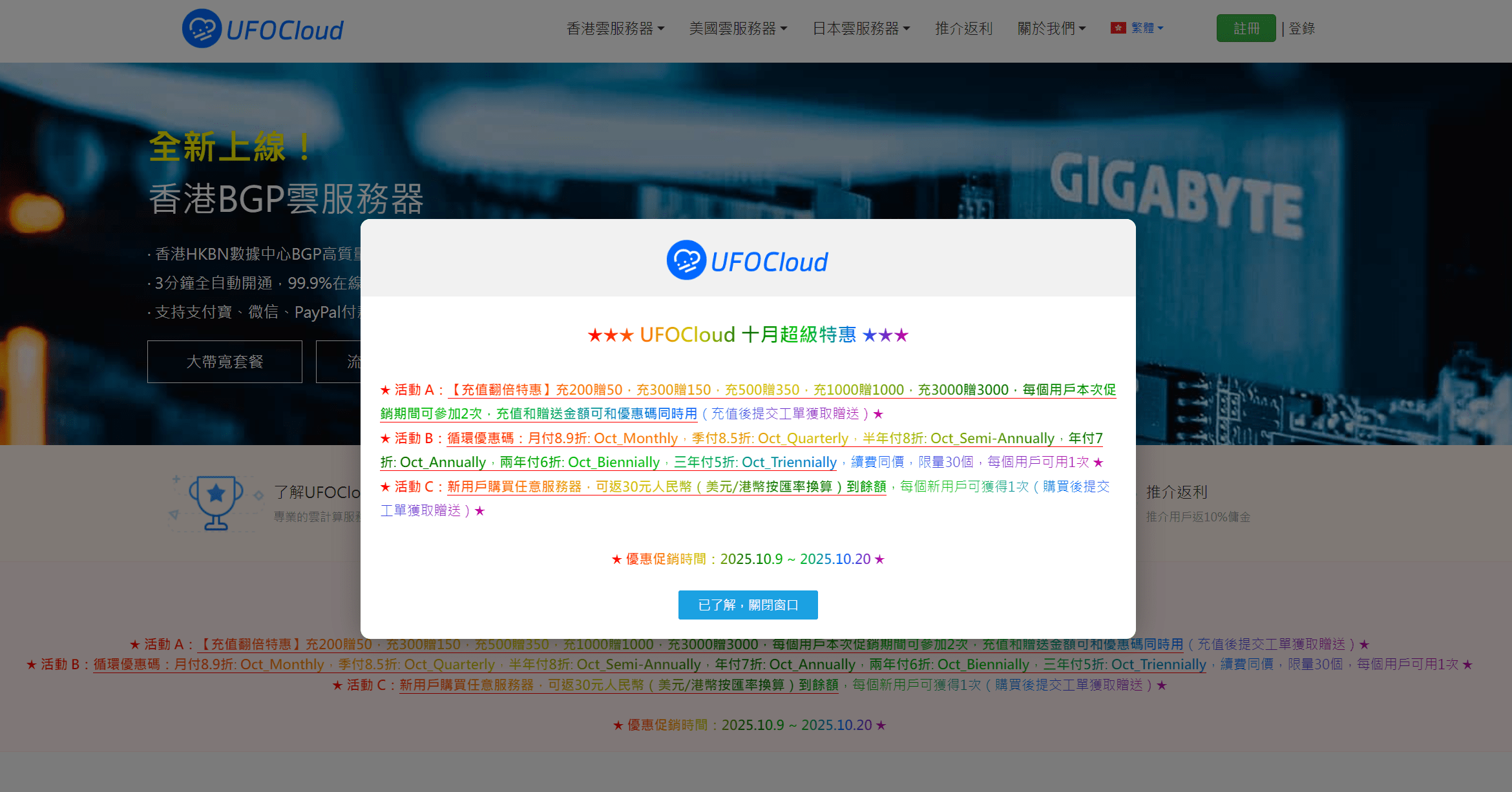 正值十月促销季,UFOCloud(原 UFOVPS)为有云服务需求的用户带来超值福利,无论是新用户首次选购,还是老用户续费升级,都能以更优惠的价格获取稳定可靠的云计算资源,其中高性价比的香港地区云服务更是本次活动的亮点,满足用户对低延迟、大带宽网络的核心需求。