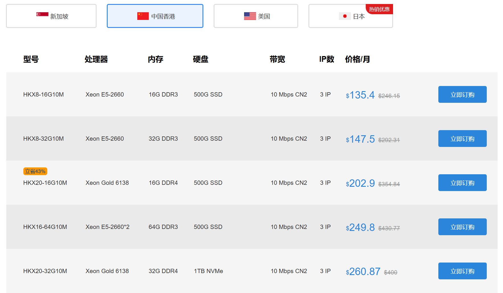 | E5-2660 | 32G | 500G | 10M CN2 | / | 香港 | $147.5/月 | 链接 |